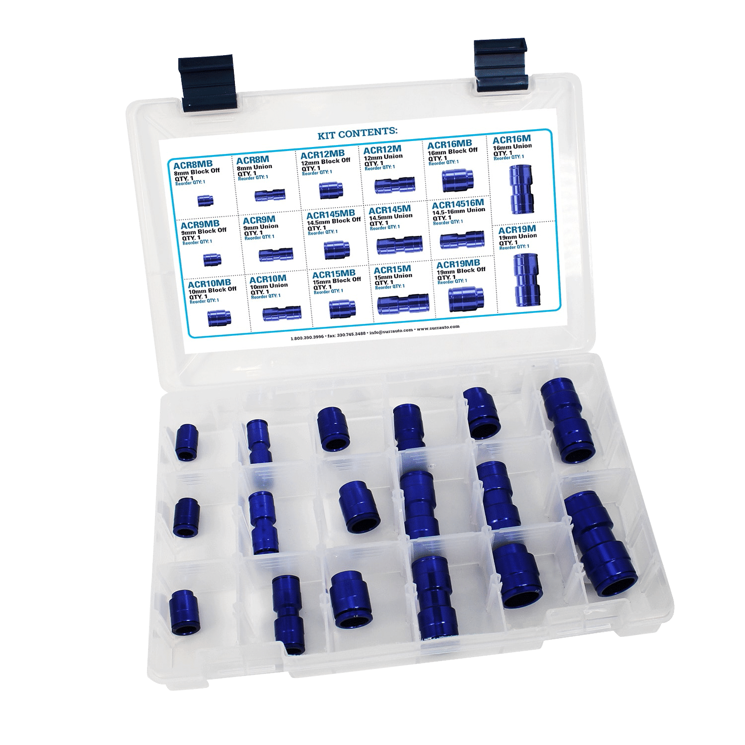 Includes 8, 9, 10, 12, 14.5, 15, 16, and 19mm unions and block offs and 14.5-16 union (Qty. 1 each, size marked on fitting)